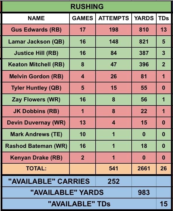 Notable Losses: Gus Edwards (Signed with Chargers), JK Dobbins (Signed with Chargers)